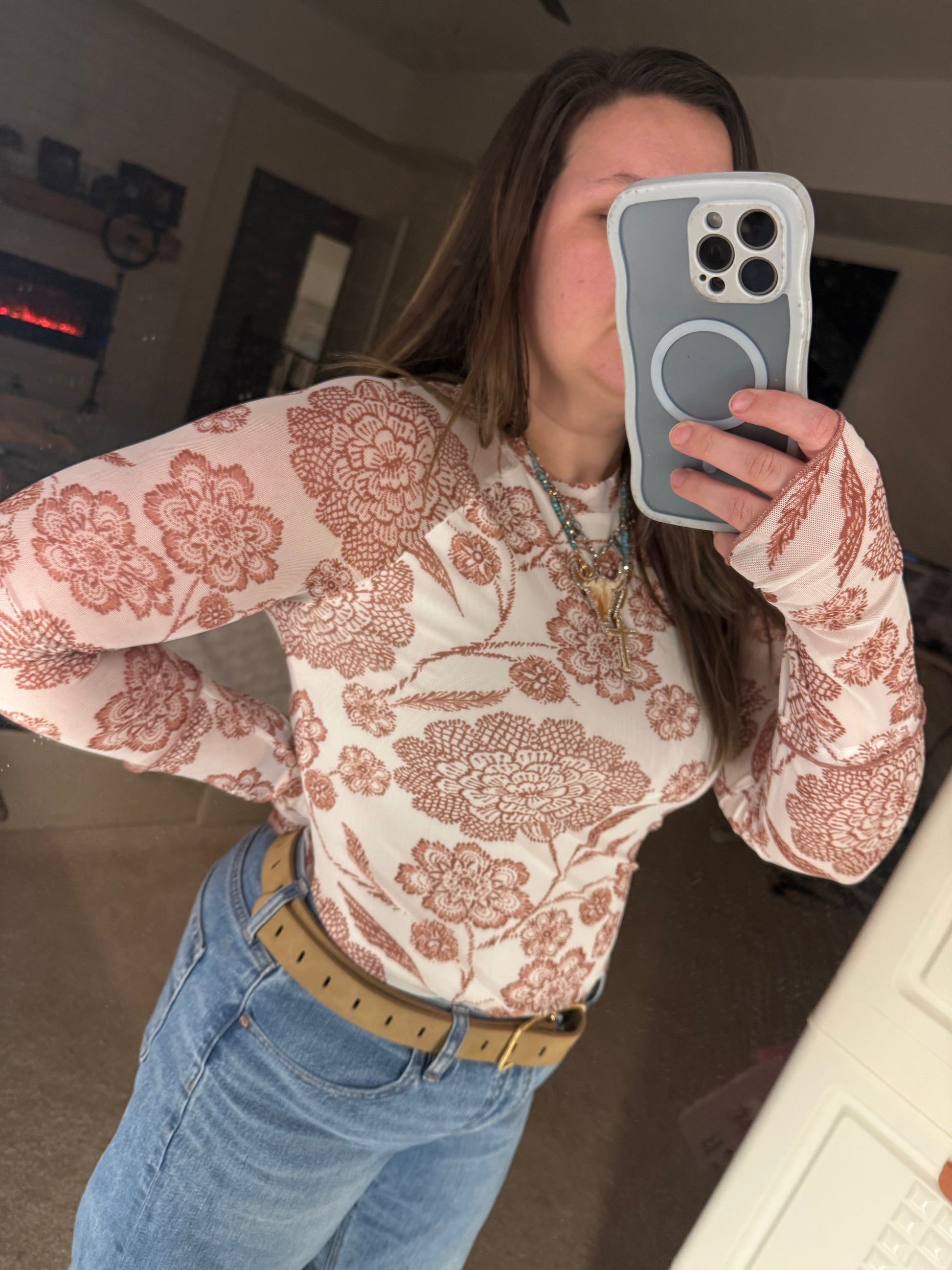 Layer this versatile mesh top under your favorite fall and winter pieces, or pair it solo with jeans for instant style. The breathable mesh fabric keeps you comfortable whether you're bundled up or enjoying milder spring days. Crafted from 95% polyester and 5% elastane, it offers the perfect blend of stretch and durability. The thumbhole detail and floral print add personality to any outfit—your new go-to for year-round layering.